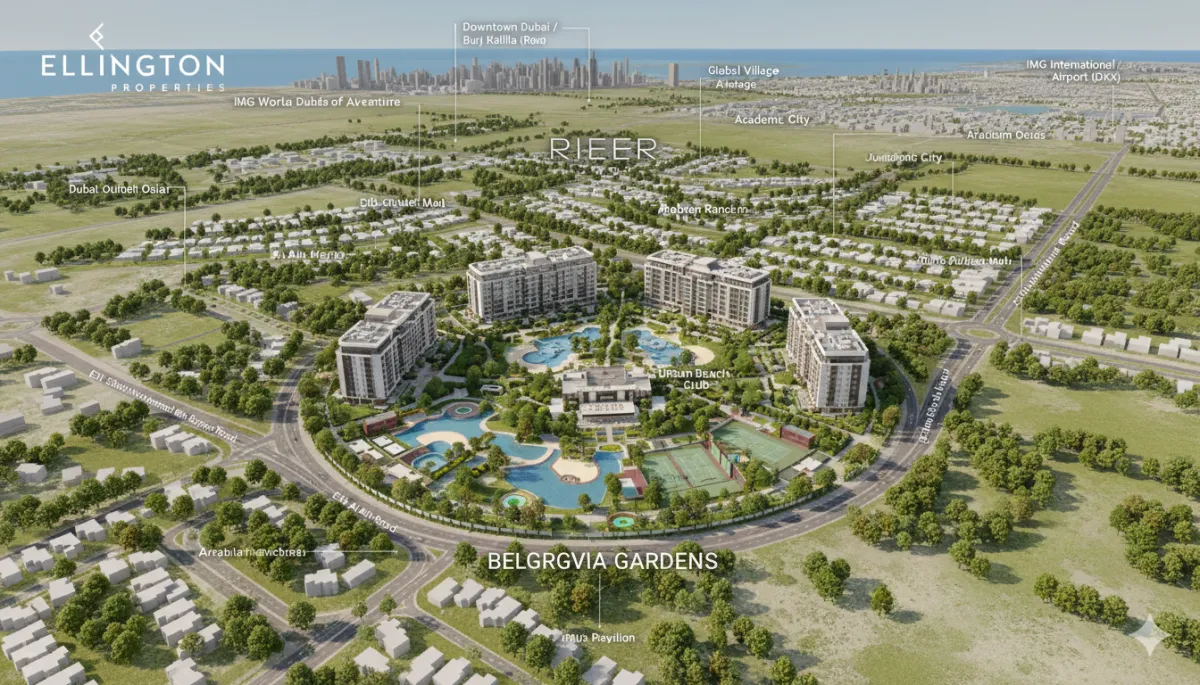 Belgravia Gardens is an exclusive residential retreat in Dubailand that blends minimalist architecture with resort-style wellness. Set within Falcon City of Wonders, the project features four low-rise buildings centered around a lush pavilion, an urban beach pool, and a signature lazy river. Strategically positioned near Sheikh Mohammed Bin Zayed Road, it offers a peaceful, green sanctuary just 20 minutes from Downtown Dubai and major leisure hubs like Global Village.